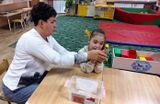 Перед продуктивной деятельностью, педагог предложила поиграть с шариком Су – Джок, где дети катали шарик прокатывали по пальцам кольцо, сопровождая движения стихами о синичке.