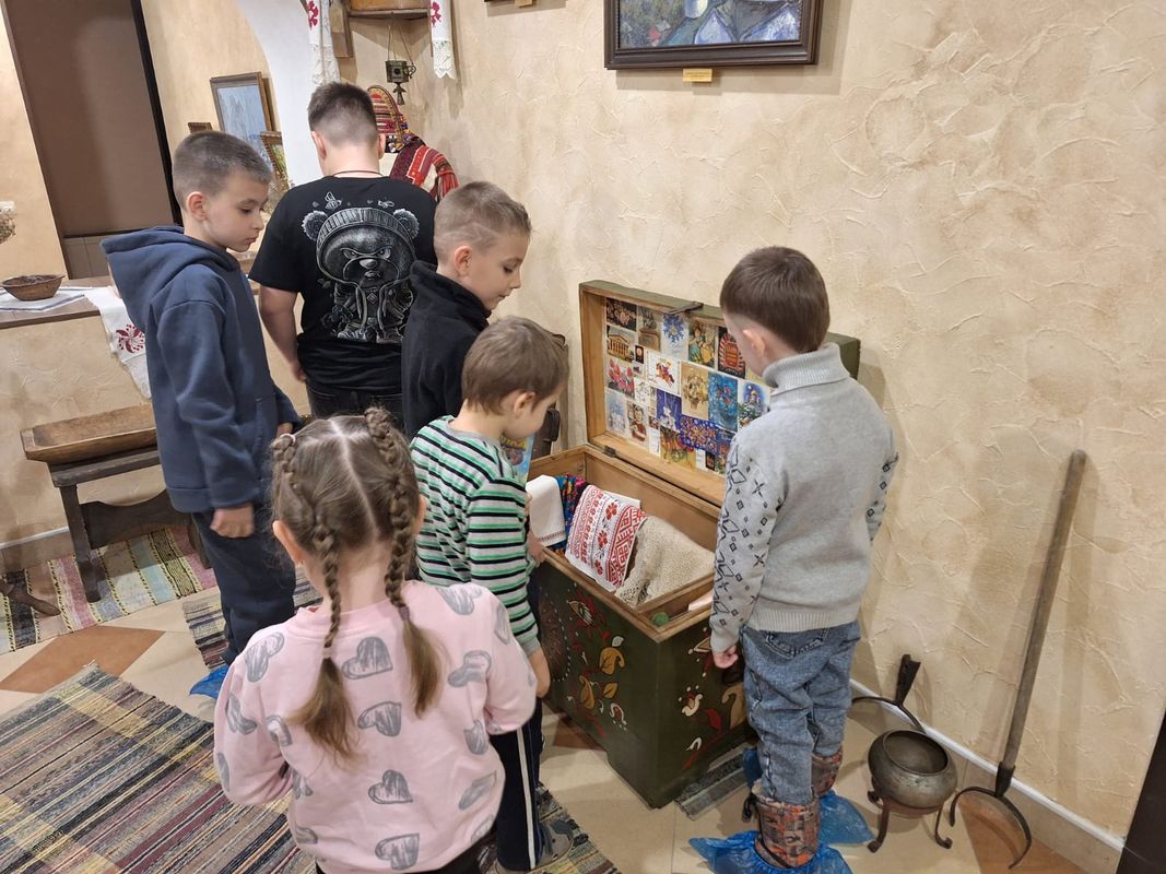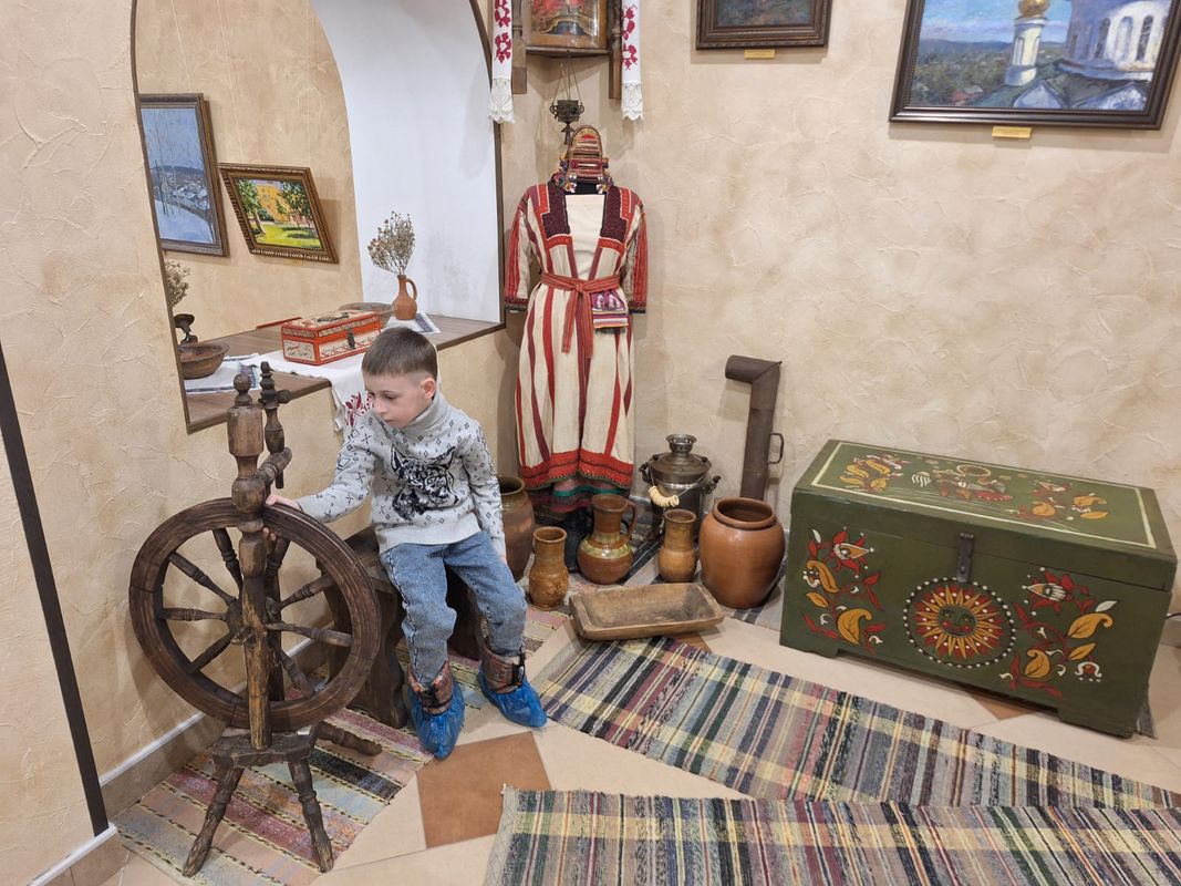 Ребята с огромным интересом знакомились с экспонатами, слушали увлекательные рассказы экскурсовода о быте и традициях наших предков. А сколько нового и интересного узнали, когда открыли «бабушкин сундук»! Там вышитые салфетки и полотенца, вязаные шали, старинные платки, что особенно заинтересовало девочек и их мам. Мальчики с восхищением рассматривали старинные предметы: чугунки, коромысла, углевые утюги, осветительные приборы, самовары, национальные костюмы.