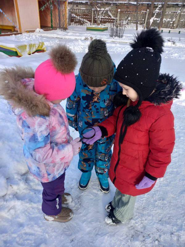 Во время прогулки юные исследователи рассмотрели снежинки через лупу, обогатили свои представления о свойствах снега. Узнали о том, что путь снежинки может составлять целый час, потому что на девять десятых снежинка состоит из воздуха, и лишь на одну десятую часть - из воды. Пришли к выводу, что многие поэты справедливо восхищались легкостью снежинки. А какими словами можно описать снежинку воспитанники продемонстрировали в речевых играх «Какой, какая?», «Узнай по описанию», «Что бывает снежным?», «Собери снежную семейку слов».