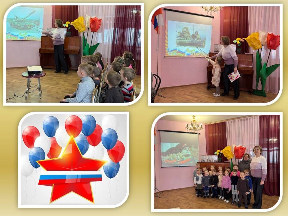 Во время занятия педагог предложила детям познакомиться с помощью презентации с различными родами войск: сухопутными, военно-воздушными и военно-морскими.
