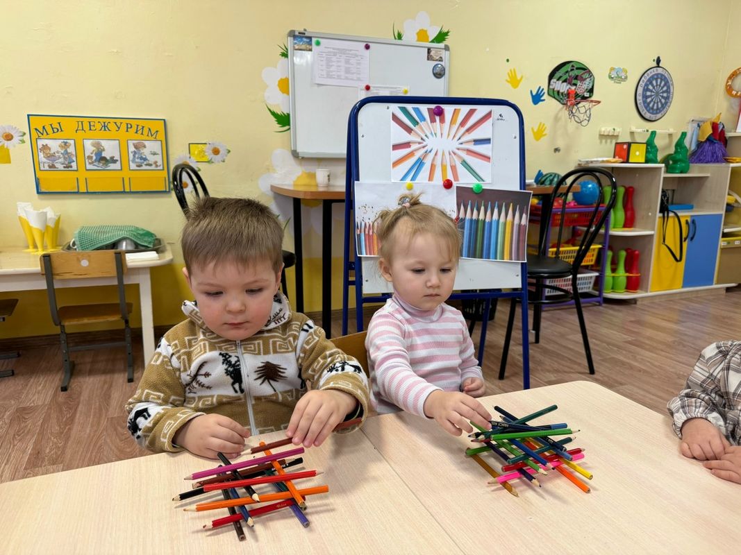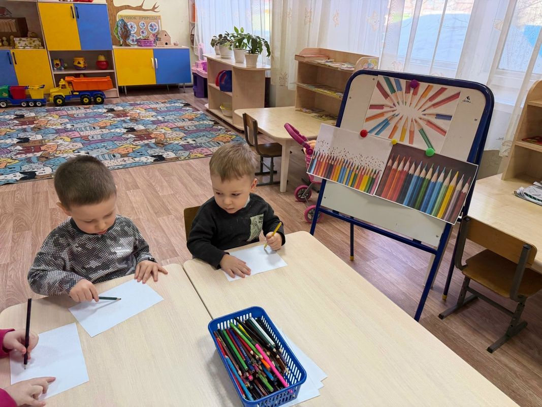 Сегодня воспитанники группы «Ромашка» вместе с воспитателем провели необычный тематический день – День радости и цветной фантазии! Мальчики и девочки стали настоящими художниками - взяли в руки разноцветные карандаши и отправились в путешествие по волшебной цветной радуге. Какие только картины не нарисовали наши юные художники – бабочки и цветочки, пирамидки и солнышко. Рисунки получились яркие, разноцветные и очень красивые. Оказывается, карандашами можно не только рисовать, но и играть: из них можно строить различные фигуры, домики, и играть с карандашами в игры «Найди домик», «Найди друга».