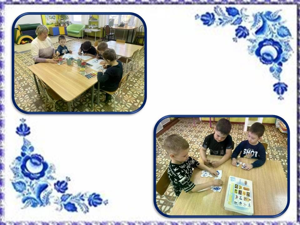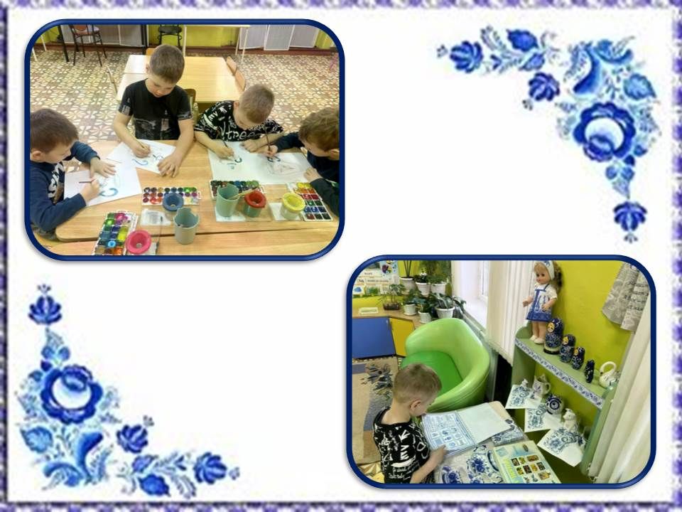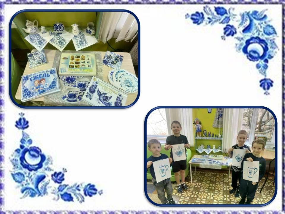 Педагоги постарались представить в мини-музее различные экспонаты со знаменитой росписью: воспитанники смогли познакомиться с альбомом «Чудо - гжель», с помощью которого узнали об истории возникновения знаменитой гжели, узнали, что гжельский узор наносится чёрным кобальтом, а свою синь она получает только после обжига. Чтобы закрепить свои знания, дети с помощью игры «Русские узоры» собирали картинки и рисовали свои рисунки на чайном сервизе.